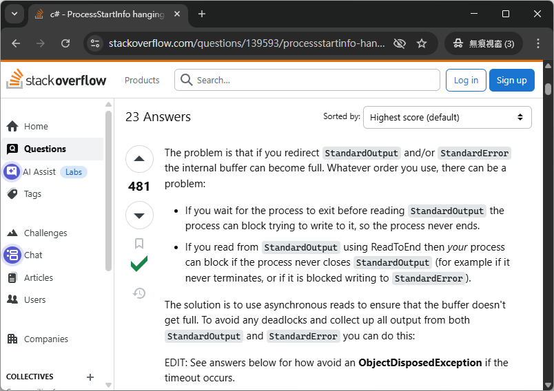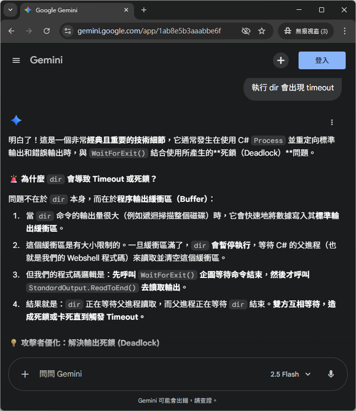 </script>解開這個謎團的成因又參考了 AI 的程式碼後,我終於理解為什麼在最初沒有 timeout 版本的 WebShell 有時會有極端指令卡住,問題出在 StandardOutput 與 StandardError 讀取的這段程式碼上。